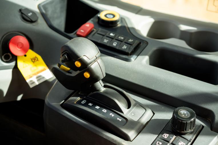 - La palanca combinada del sistema de elevación/transmisión, exclusiva de Caterpillar, agrupa varios controles en una única palanca, incorpora el freno de estacionamiento y reduce la interacción del operador hasta en un 50 %.