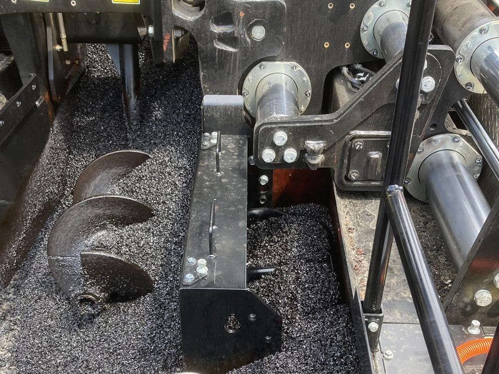 El diseño del sistema alimentador con ahoyadores de 355 mm (14") de diámetro ofrece un flujo de material uniforme en toda la regla para realizar un trabajo eficiente con cualquier anchura de pavimentación, ya sea ancha o estrecha.